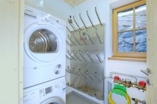 Im Erdgeschoss befinden sich ebenfalls die Garderobe und der Technikraum mit Waschmaschine, Trockner und Skischuhtrockner. Hier ist Platz für 12 Paar Skischuhe
