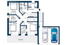 Plan im Erdgeschoss, Terrasse und Carport des Chalets